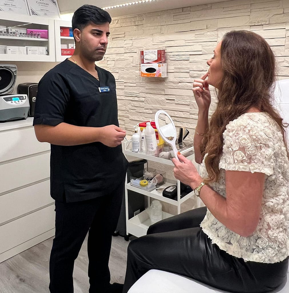 Vid konsultationen undersöker läkaren ditt ansikte och din hud. Ni diskuterar dina förväntningar och du får information om ingreppet, risker och kostnader.